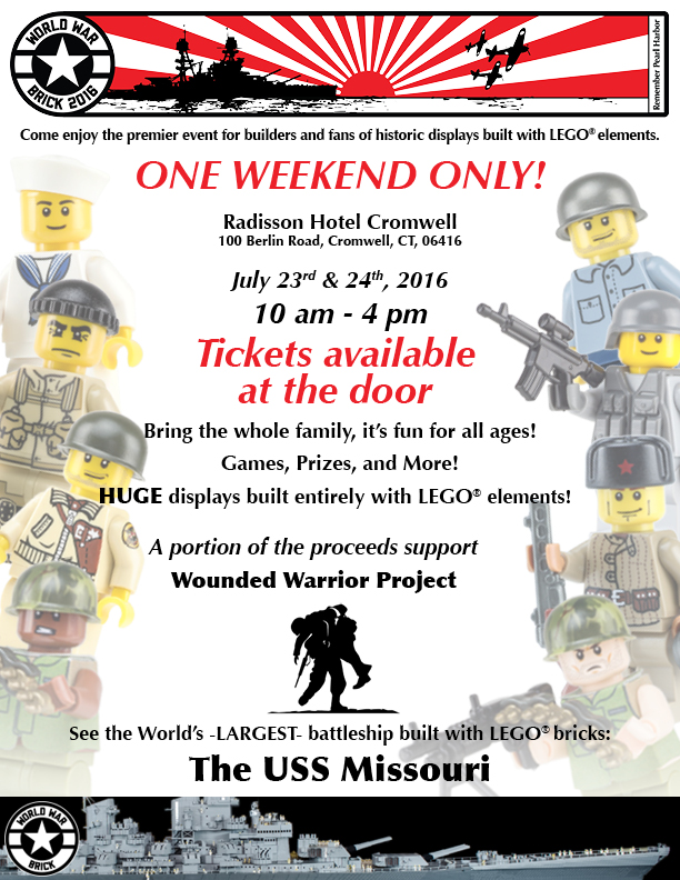 World War Brick Hartford is happening on July 22-24 at the Radisson Hotel Cromwell, just outside Hartford Connecticut. We are a family-friendly gathering of LEGO® fans who enjoy building and sharing our historic and military models. World War Brick has been happening since 2011 and is organized by Brickmania LLC, the first name in custom military building kits for the LEGO enthusiasts, with special help from our sponsors BrickArms and GI Brick.